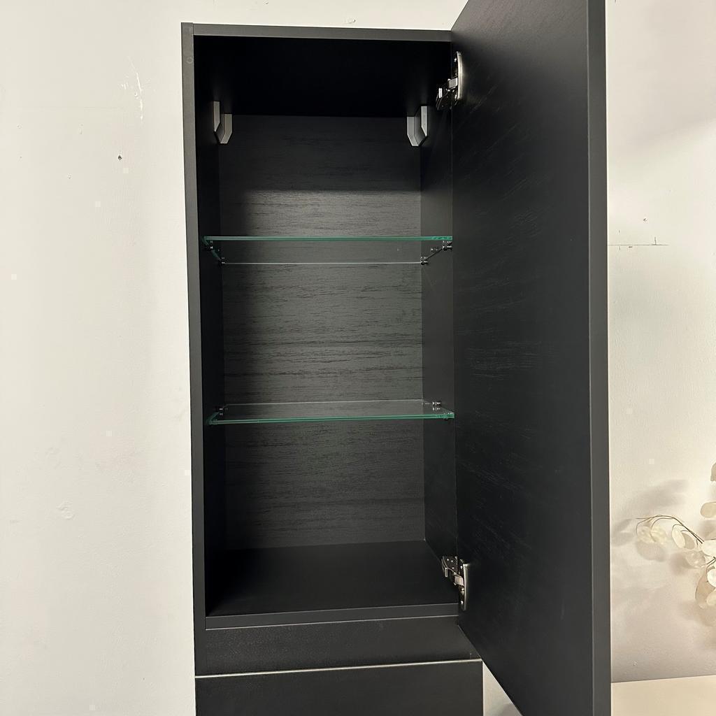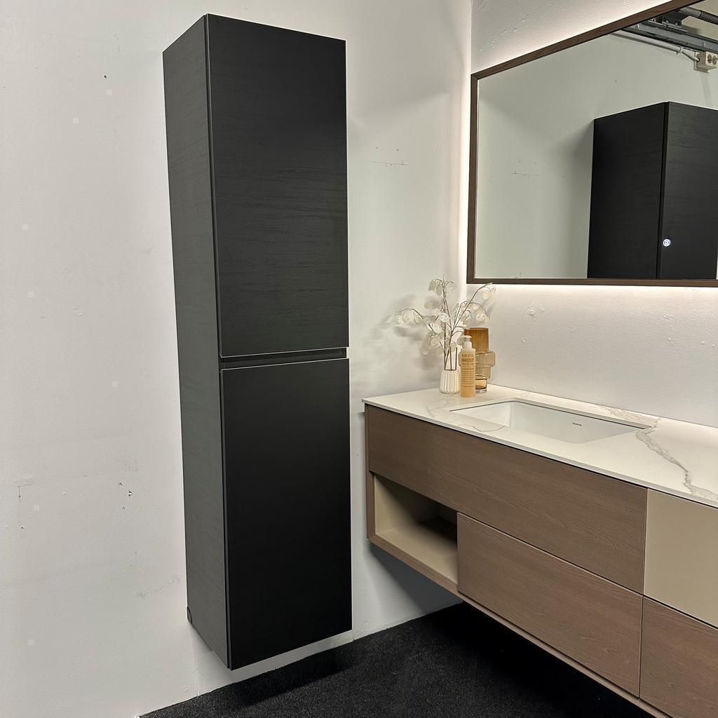 Mooie, kwalitatieve hoge badkamerkast van Detremmerie, uitgevoerd in zwart wengé fineer. Deze kast heeft altijd in de showroom gehangen en verkeert in nette staat. Ideaal voor extra opbergruimte in de badkamer.