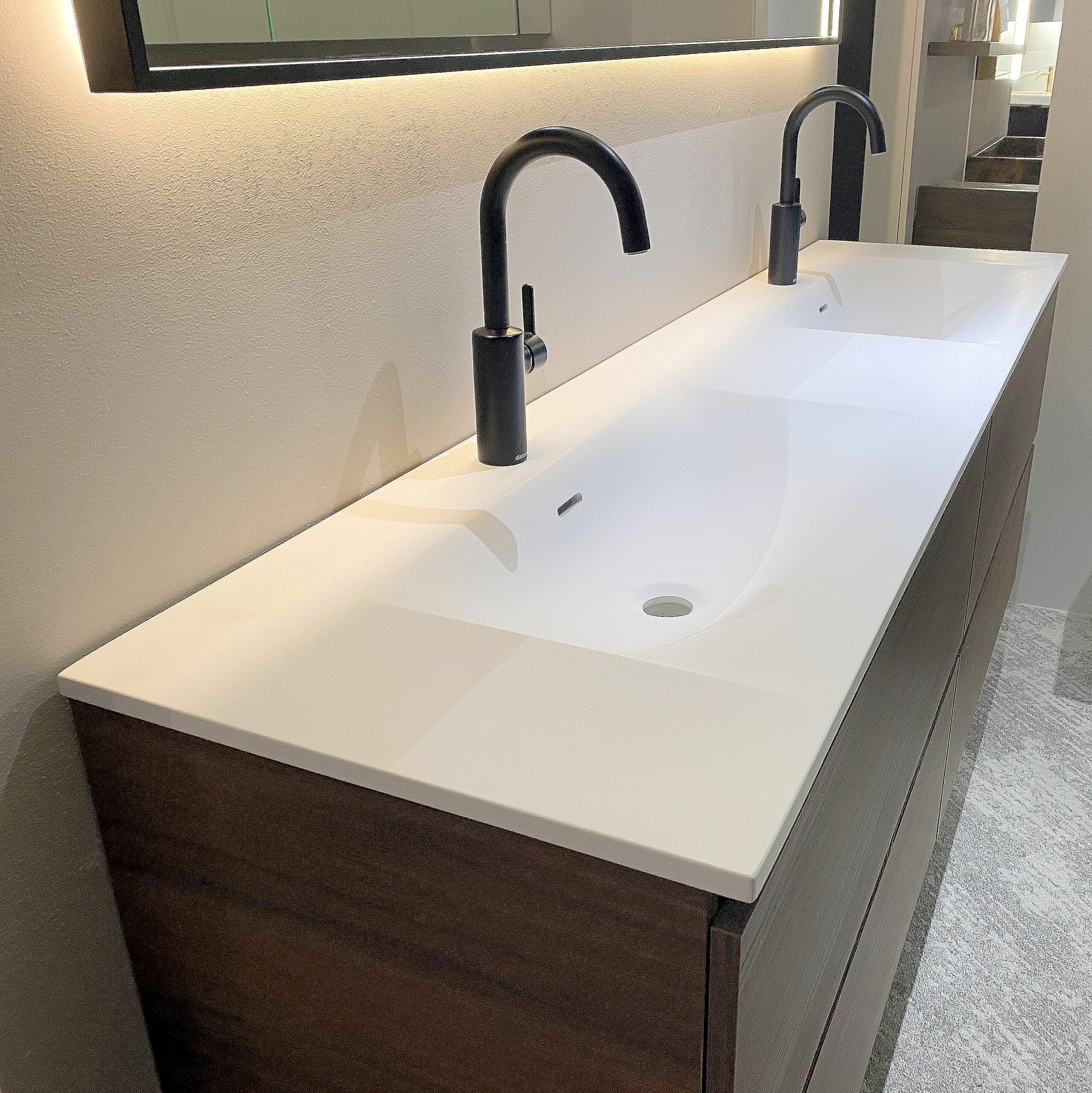 Het mat witte Top Solid wastafelblad met twee wasbakken, twee kraangaten en bijpassende witte klikwastes vormt een mooi contrast met de walnoot onderkast. De royale spiegel is voorzien van verlichting rondom in de spiegel voor optimaal functioneel licht en indirecte verlichting aan de buitenzijde voor extra sfeer. Dankzij de touchbediening is de verlichting eenvoudig dimbaar.