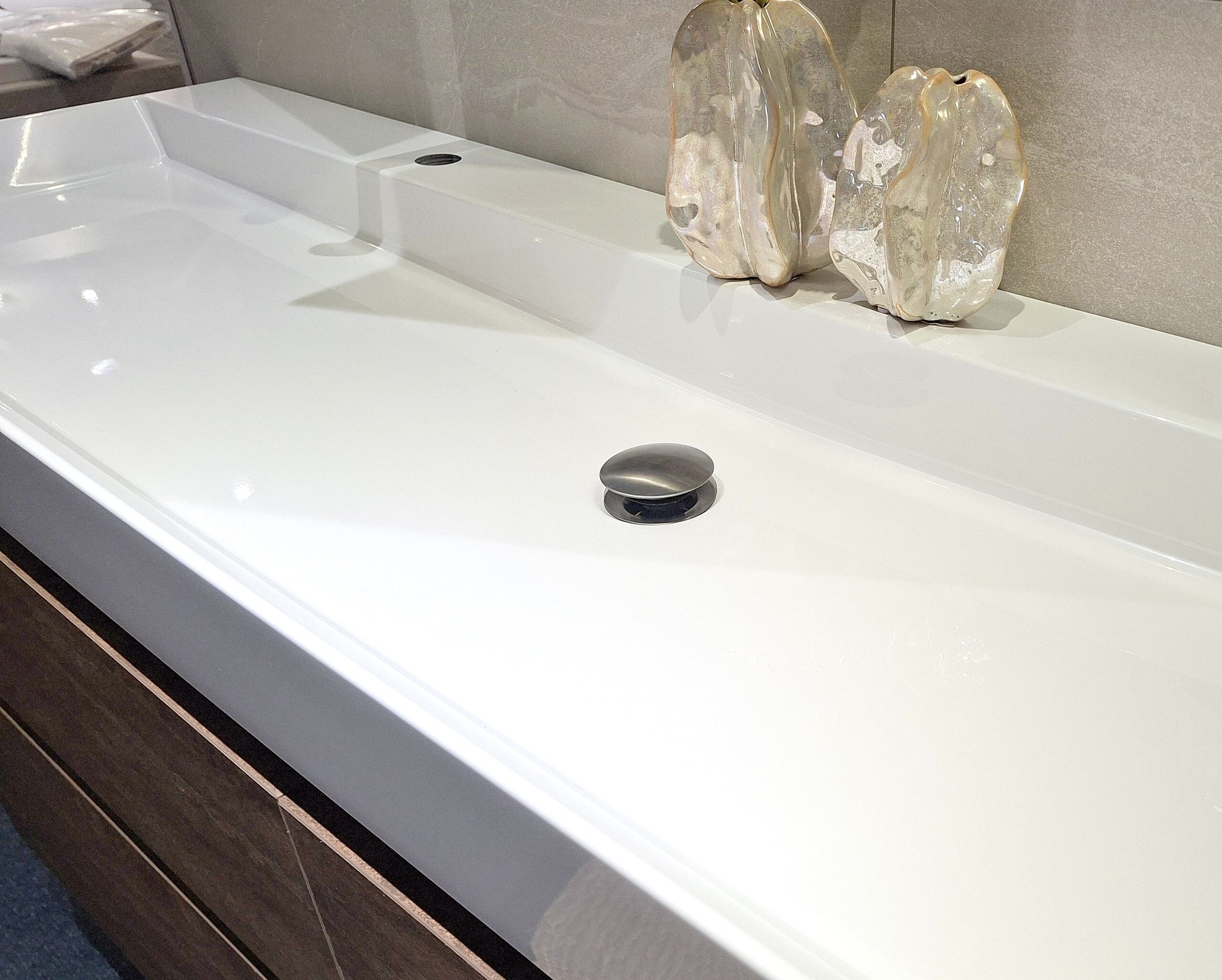 Het Thebalux Space wastafelblad staat bekend om zijn minimalistische uitstraling en praktische indeling. Dankzij de beperkte diepte behoudt u optimale bewegingsruimte in de badkamer.