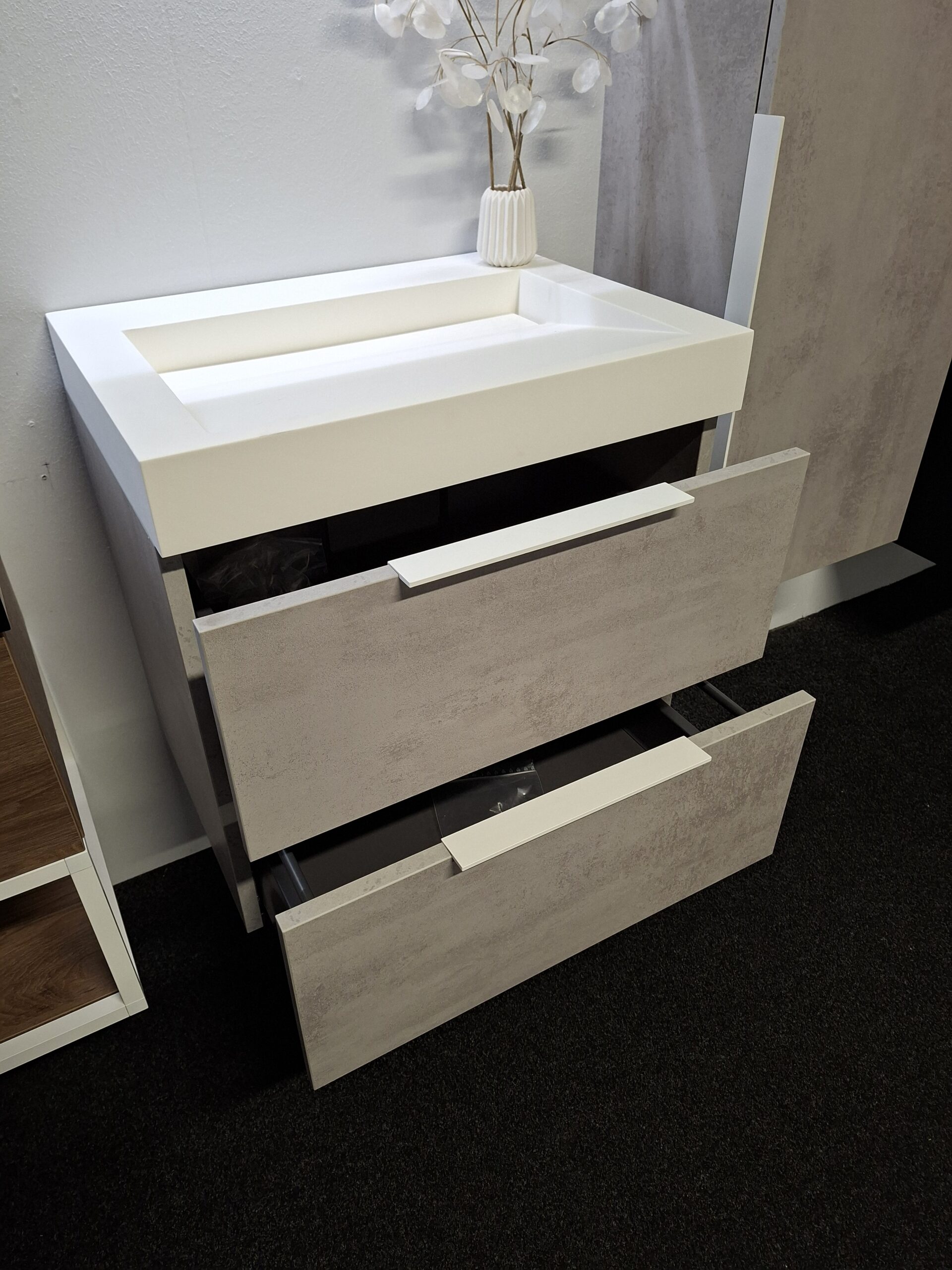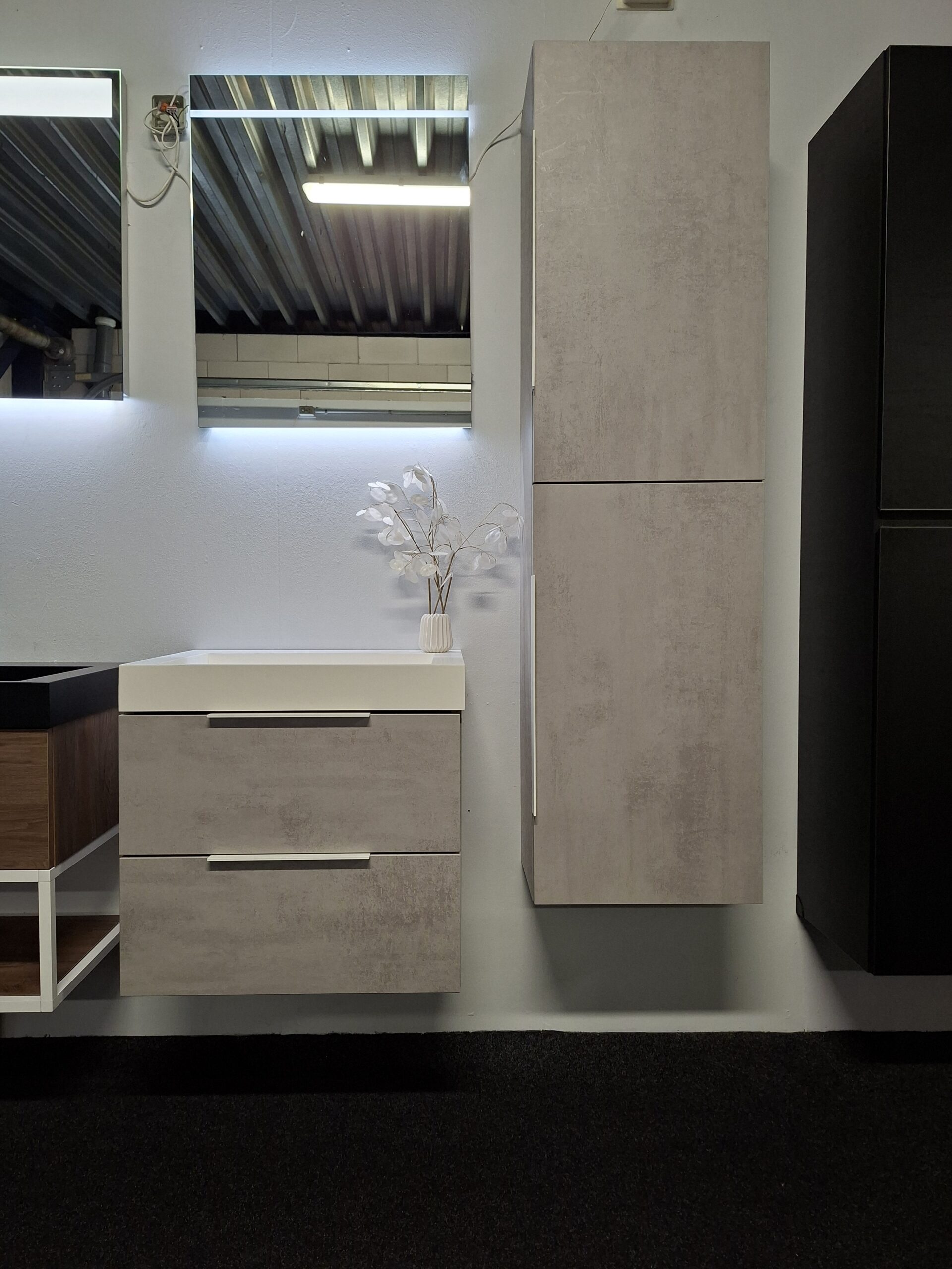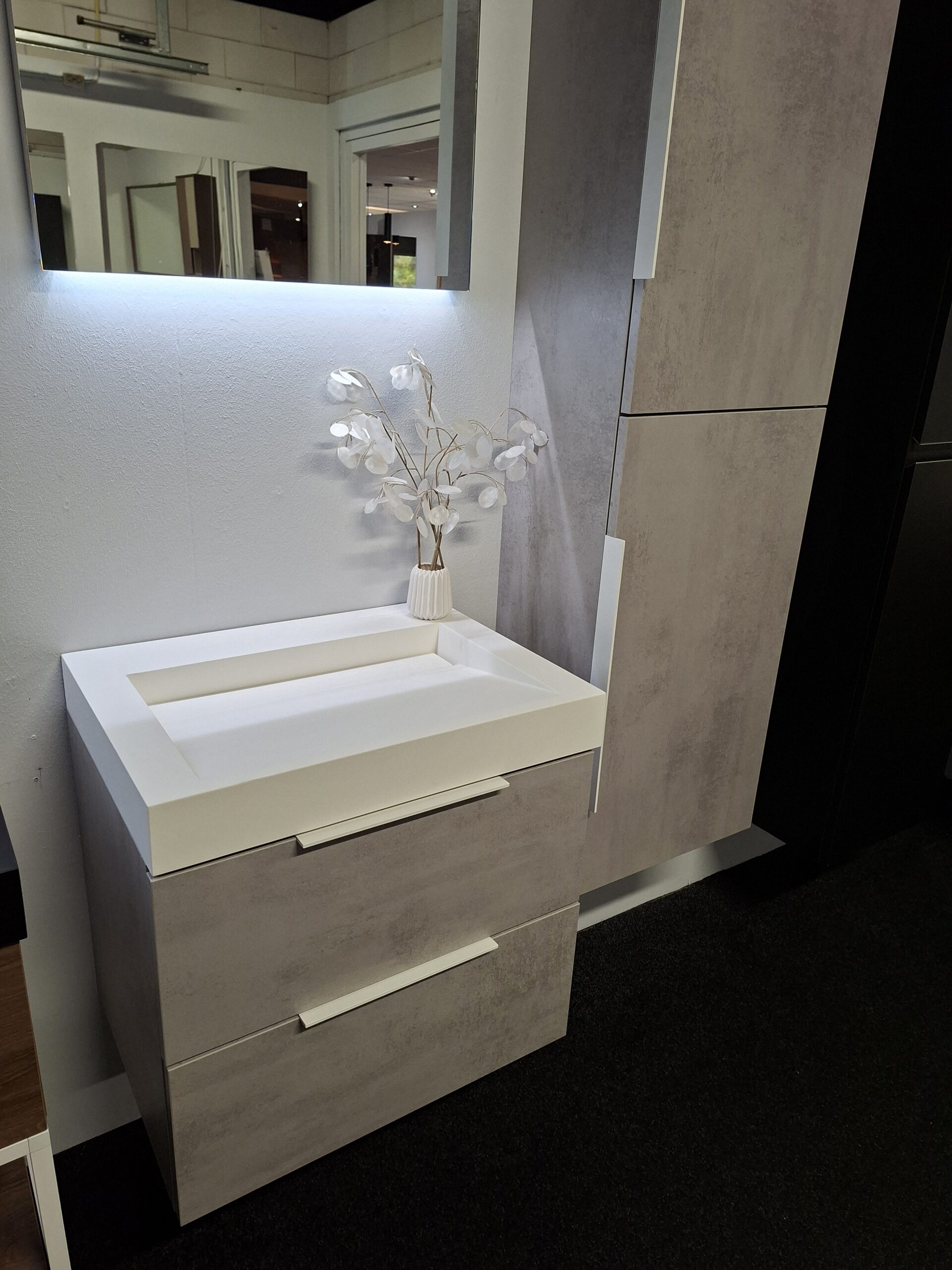 Thebalux Showroomset Wasmeubel met hoge kast – Beton Zilver met witte Noella Grepen!