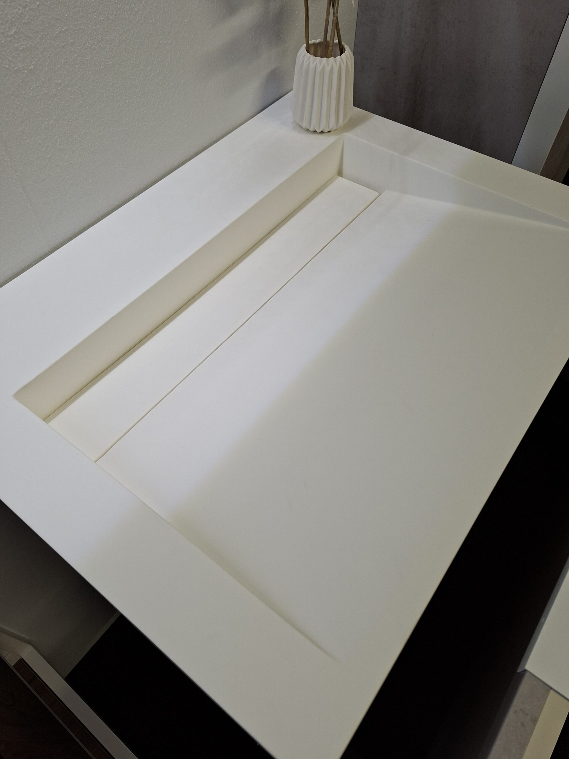 De set is compleet met de strakke matwitte wastafel Canyon, zonder kraangat (optioneel zelf te boren).