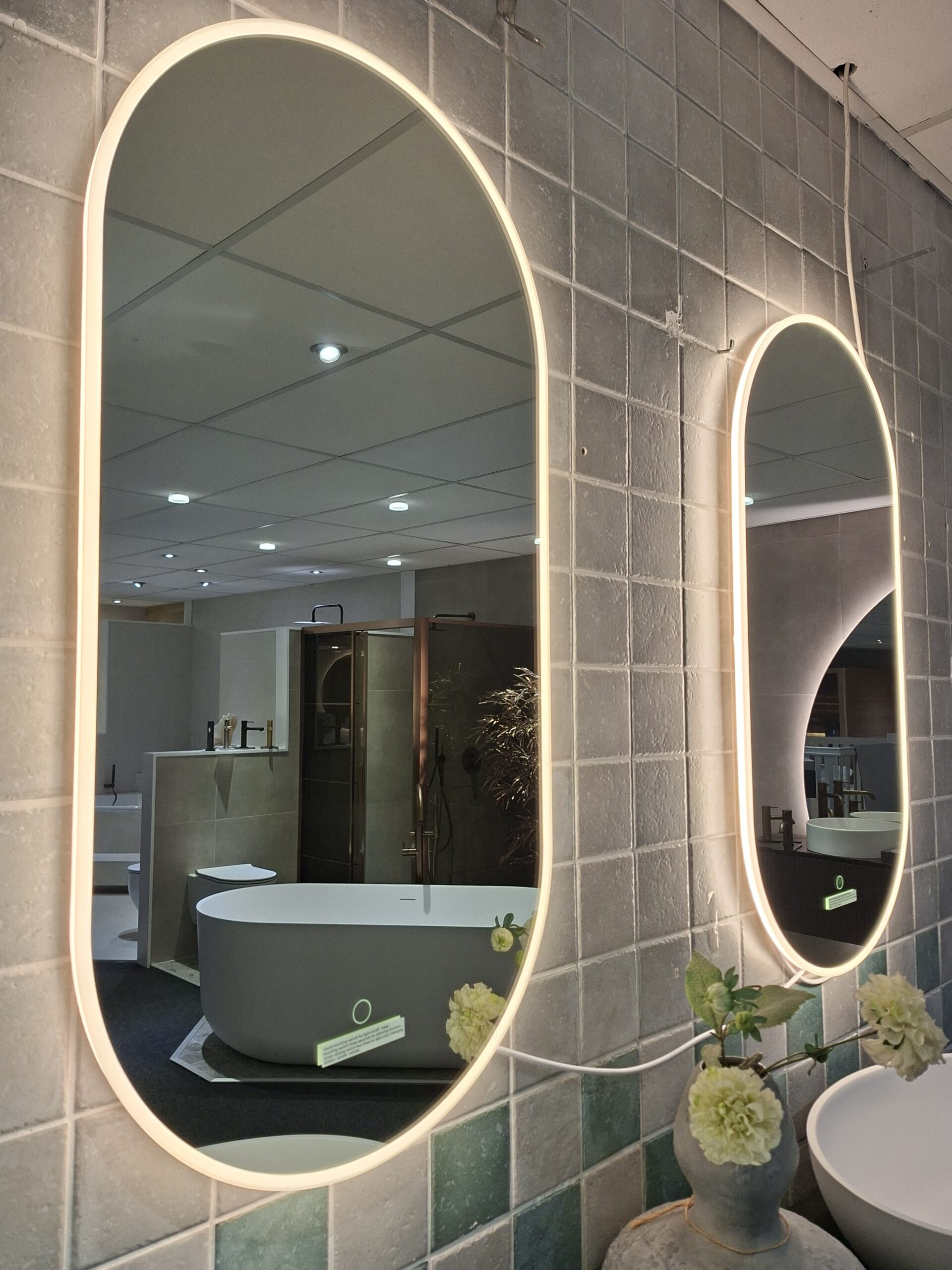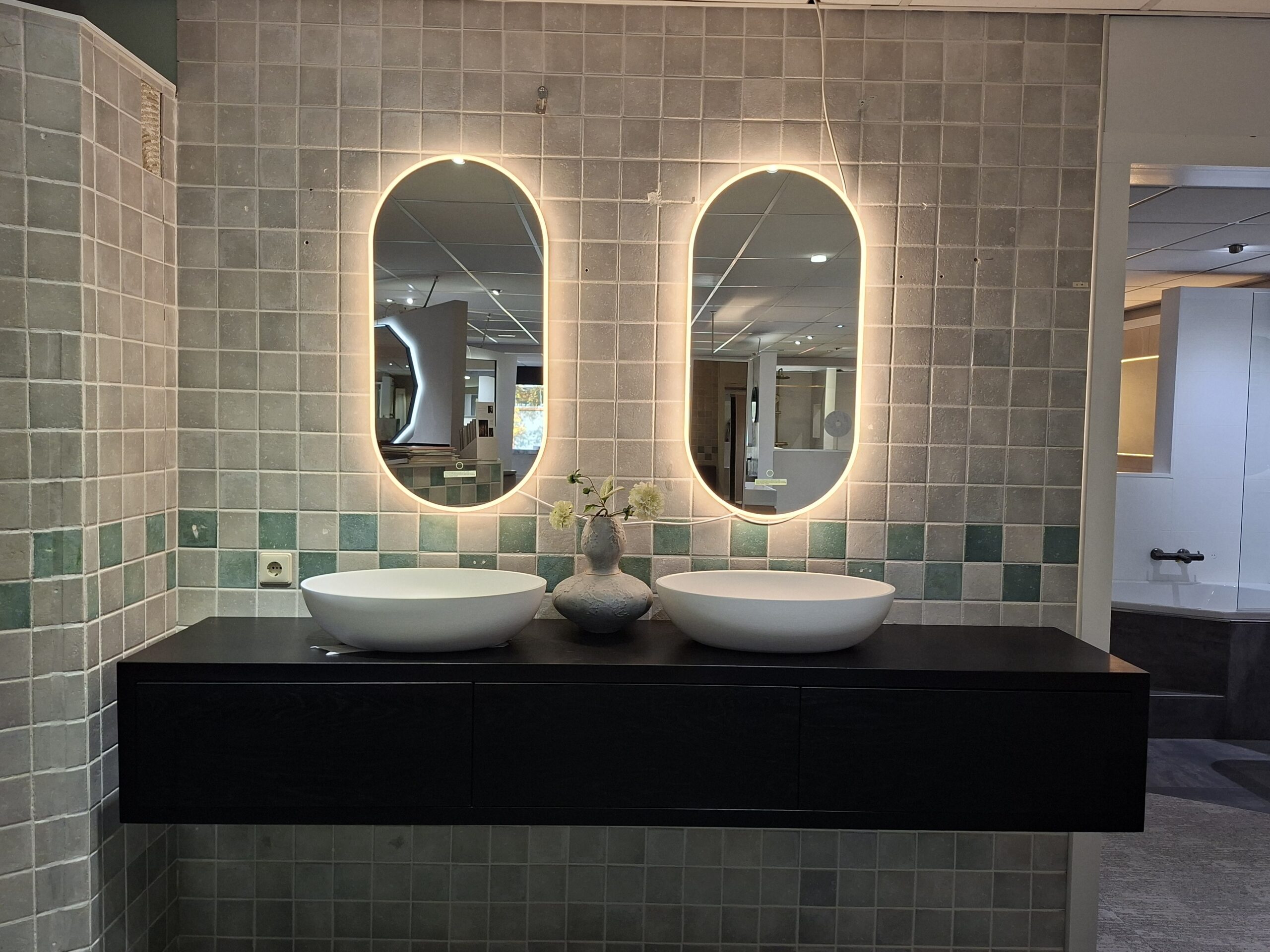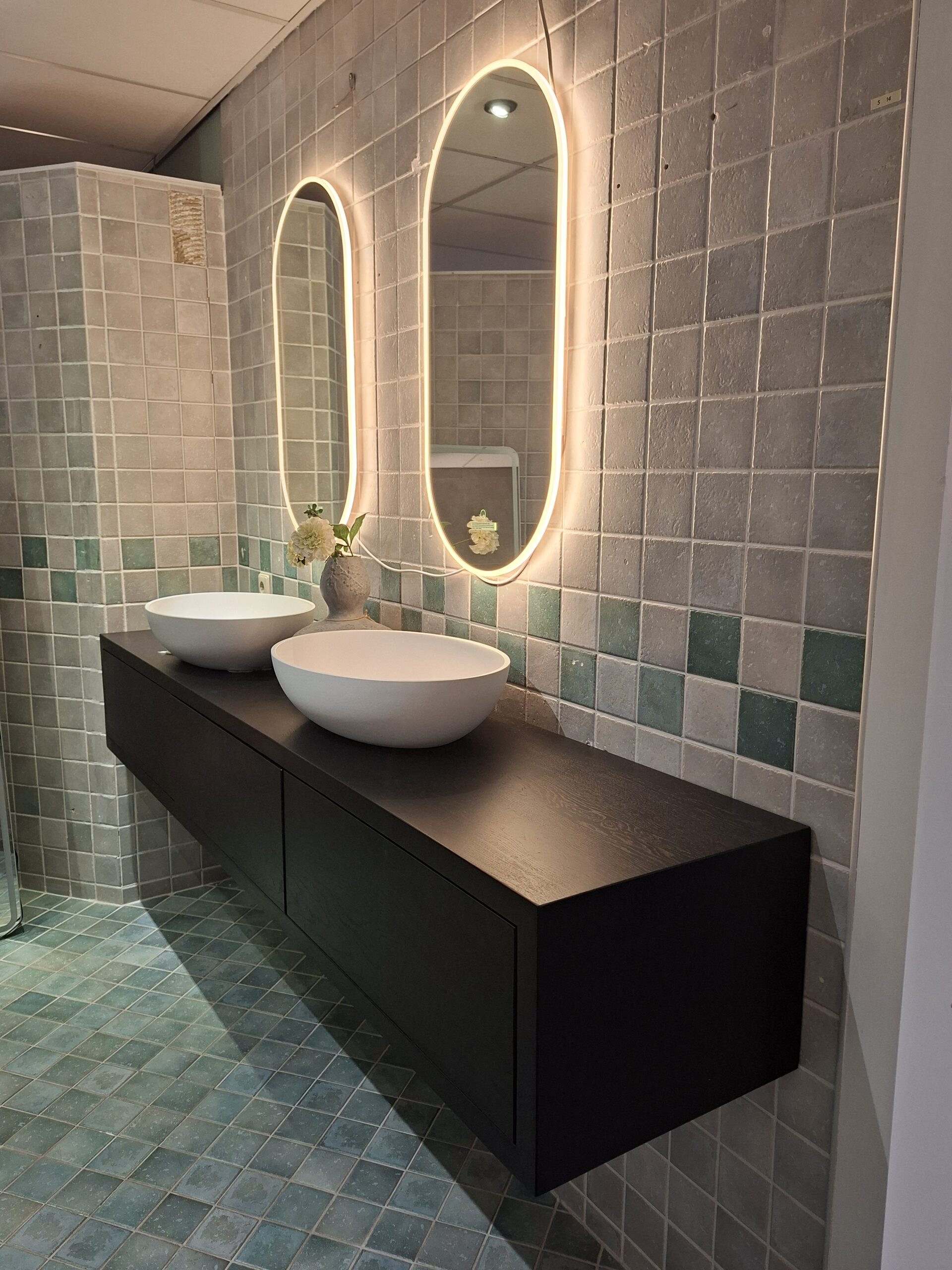 Het geheel vormt een verfijnde balans tussen modern en stoer. De zachte vorm van de waskommen gecombineerd met de krachtige uitstraling van het zwarte hout en de elegante ovale spiegels maakt deze set een echte blikvanger. Perfect voor wie zoekt naar kwaliteit, stijl en functionaliteit in één.