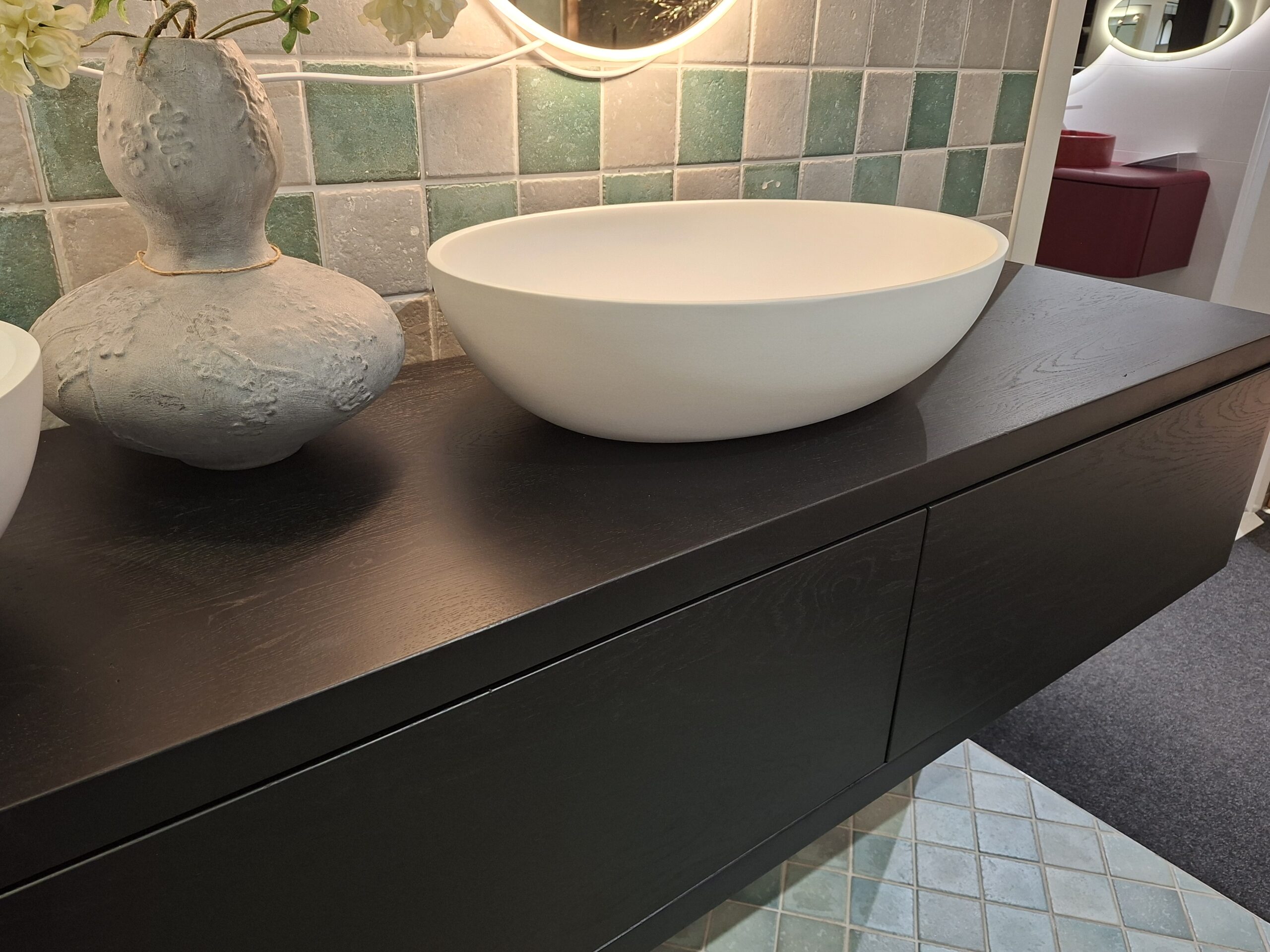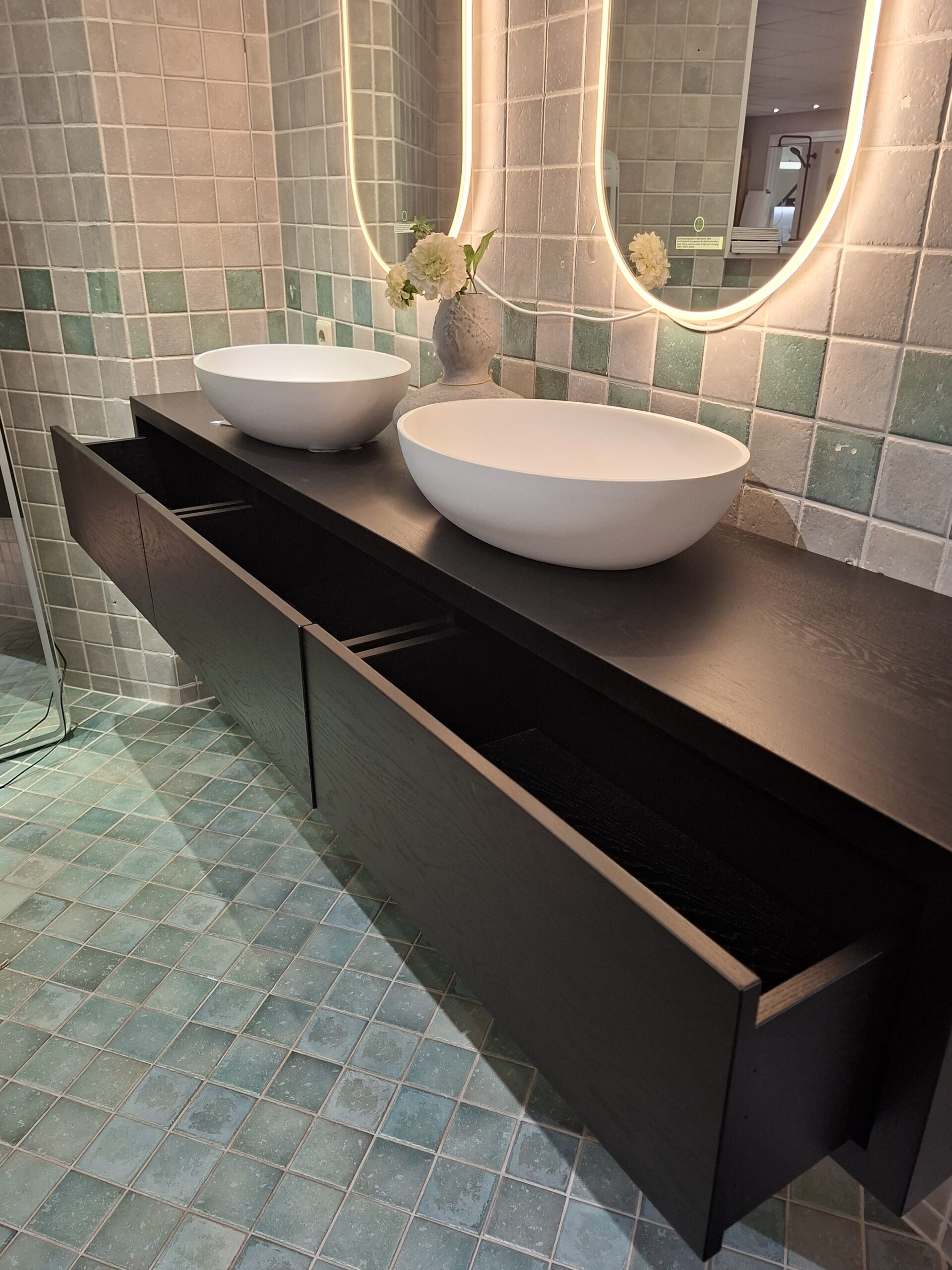 Stoer, stijlvol en tijdloos! Deze complete badkameropstelling is nu beschikbaar als showroommodel. Gemaakt van massief eiken en afgewerkt in diep zwart, waardoor het meubel direct een luxe uitstraling geeft. De robuuste kwaliteit voel je meteen: dit is een meubel dat jarenlang meegaat.