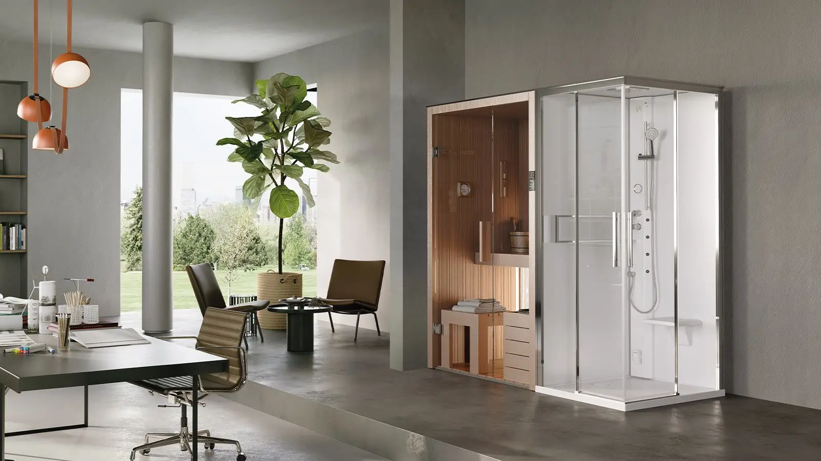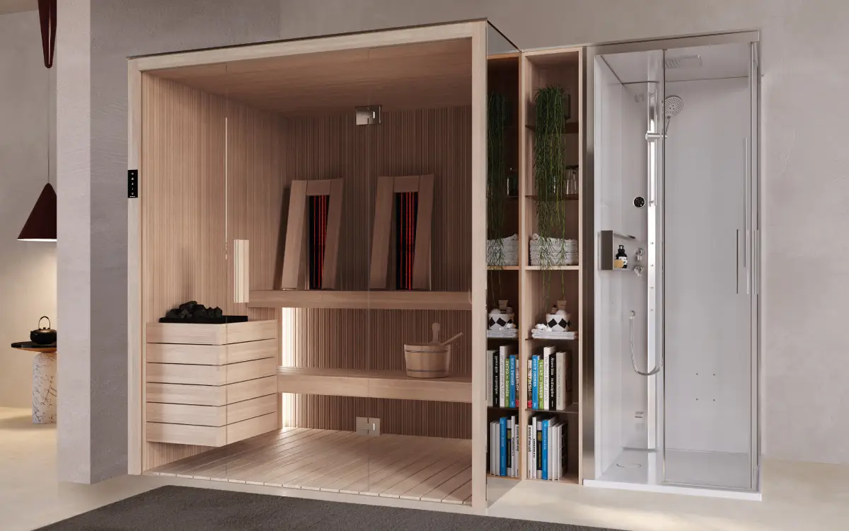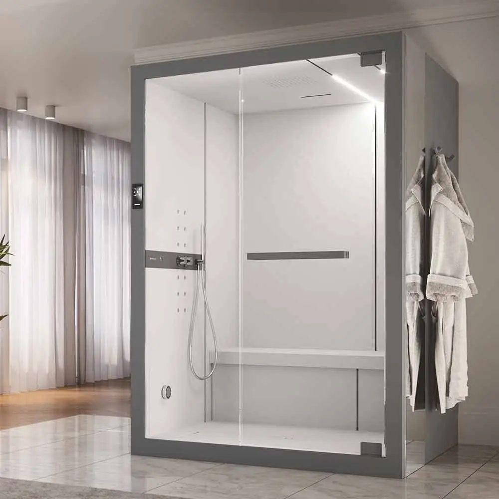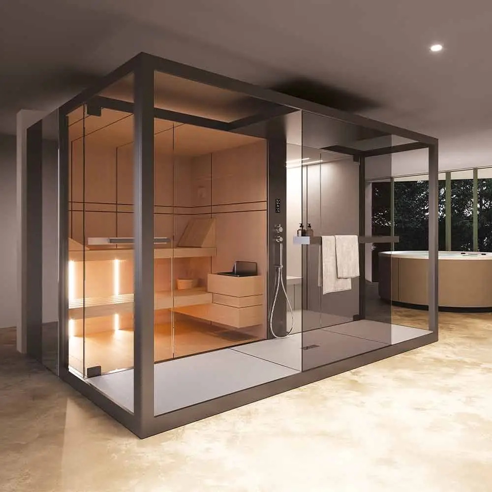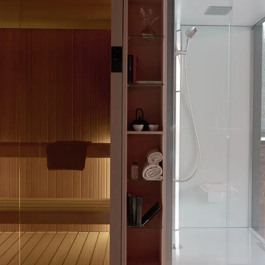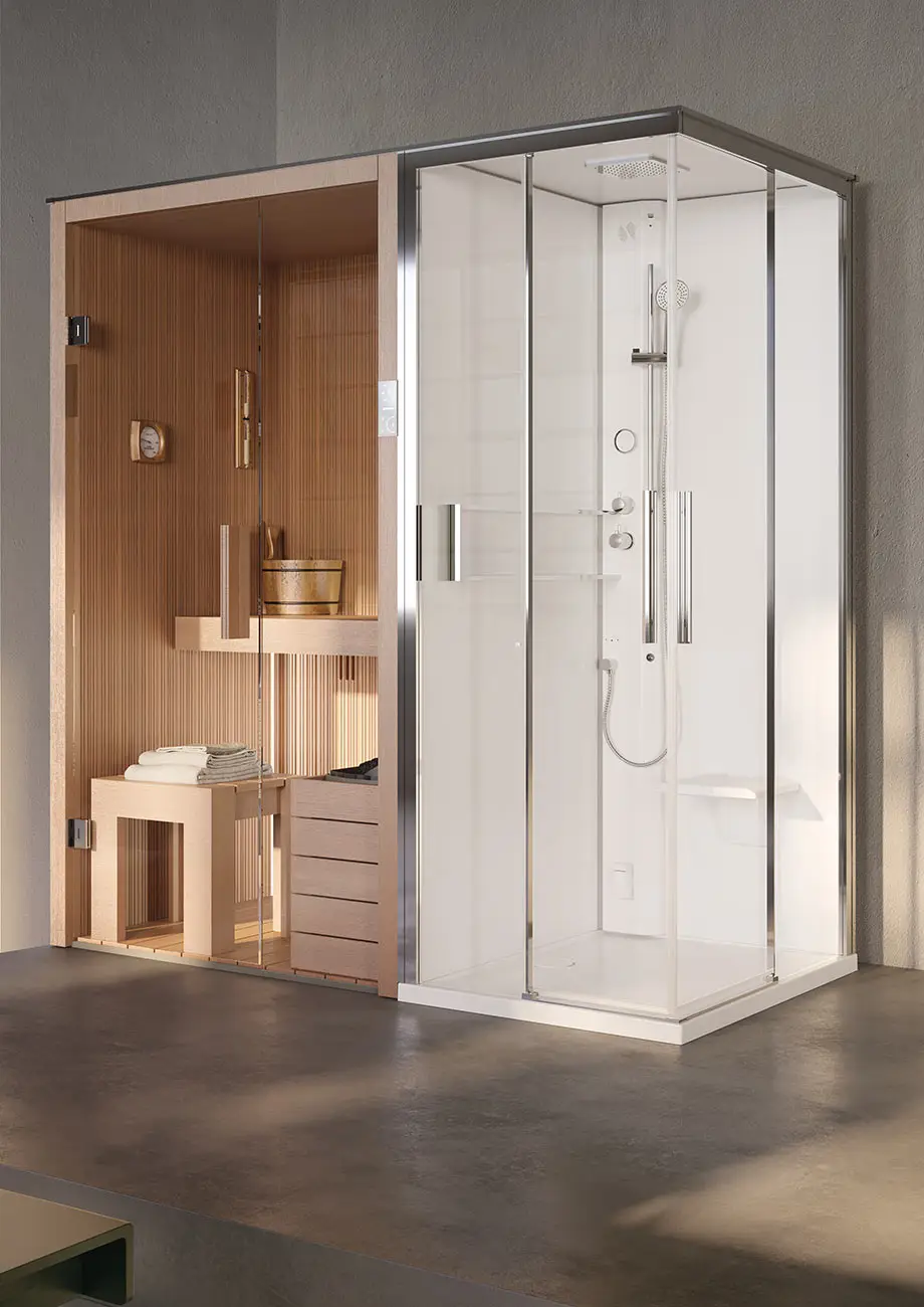 The design connecting a Novellini Glax cabin to the Fun sauna is conceived to ensure practicality and functionality. This connection optimizes space, making the experience even more complete, accessible, and versatile, without compromising on comfort and quality.