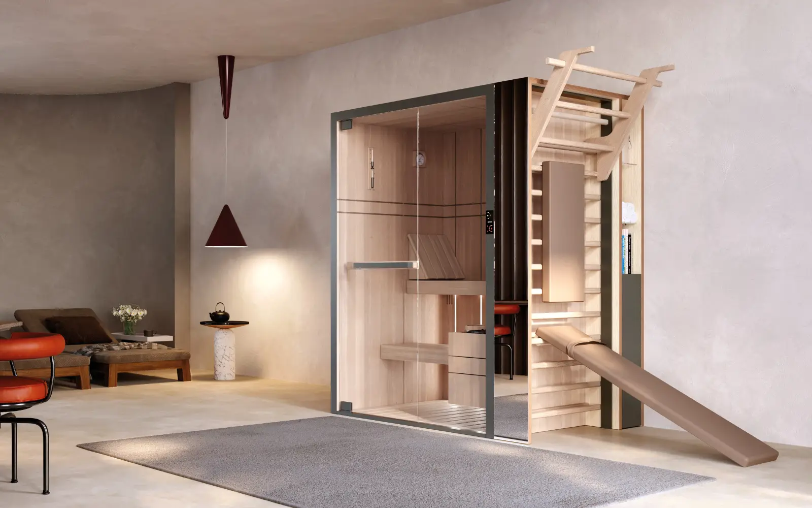 Het assortiment sport- en ontspanningsaccessoires voor sauna’s, ontworpen om de ontspanning te verbeteren en woonruimtes stijlvol en functioneel in te richten.