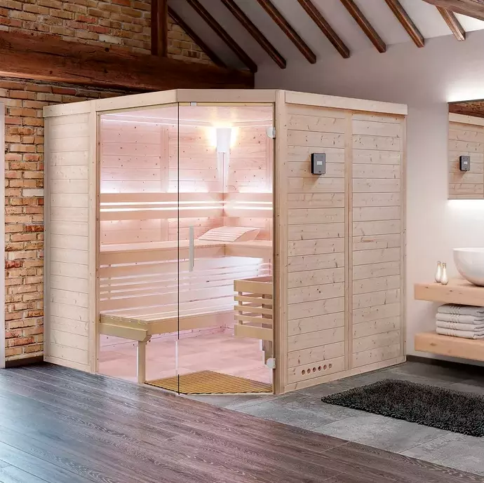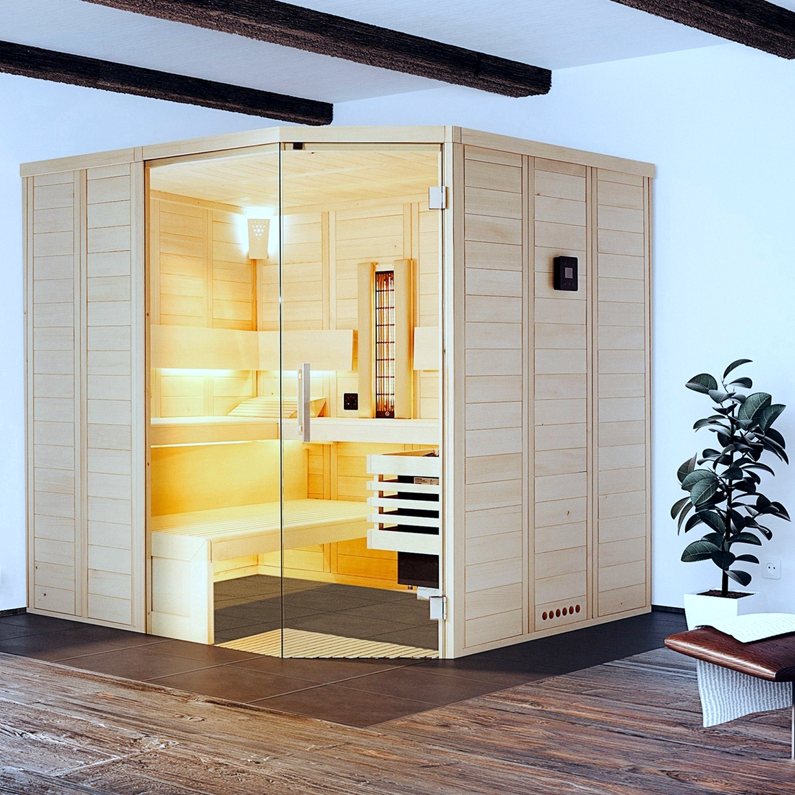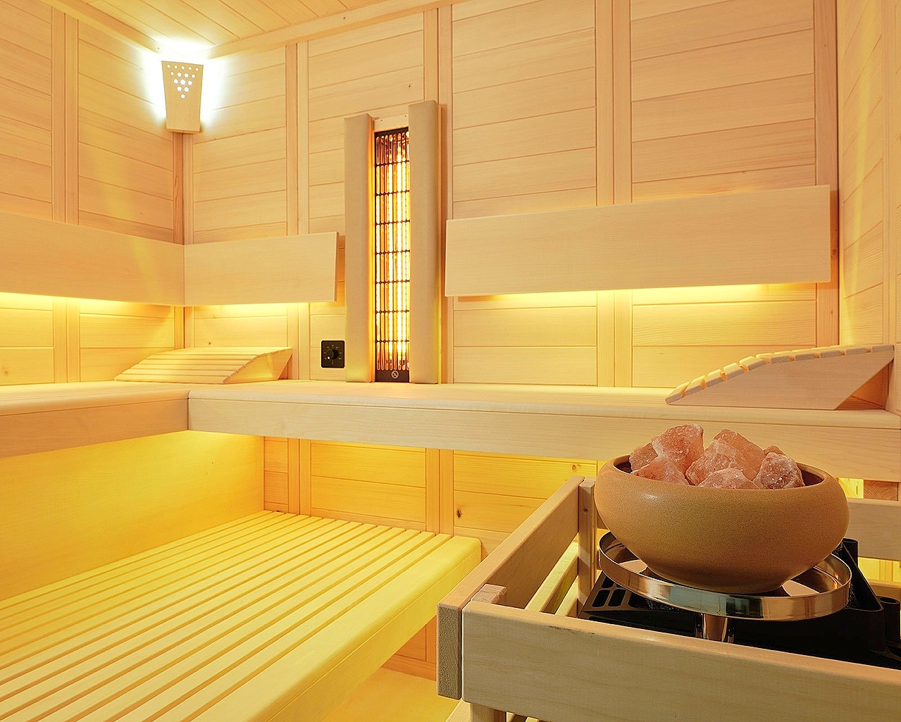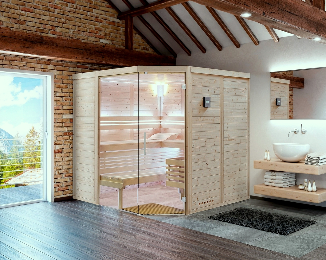 De binneninrichting “Norma” is gemaakt van hoogwaardige, noestarme houtsoorten zoals Espen of Ayous — ideaal voor saunabanken dankzij hun lage warmtegeleiding en vochtbestendigheid.