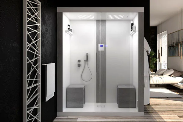 De +160 is een dubbele multifunctionele cabine waarin je aan de ene kant kunt douchen voor de dagelijkse lichaamsverzorging en aan de andere kant kunt genieten van een echte wellnesservaring dankzij de verkwikkende kracht van het Turkse bad.