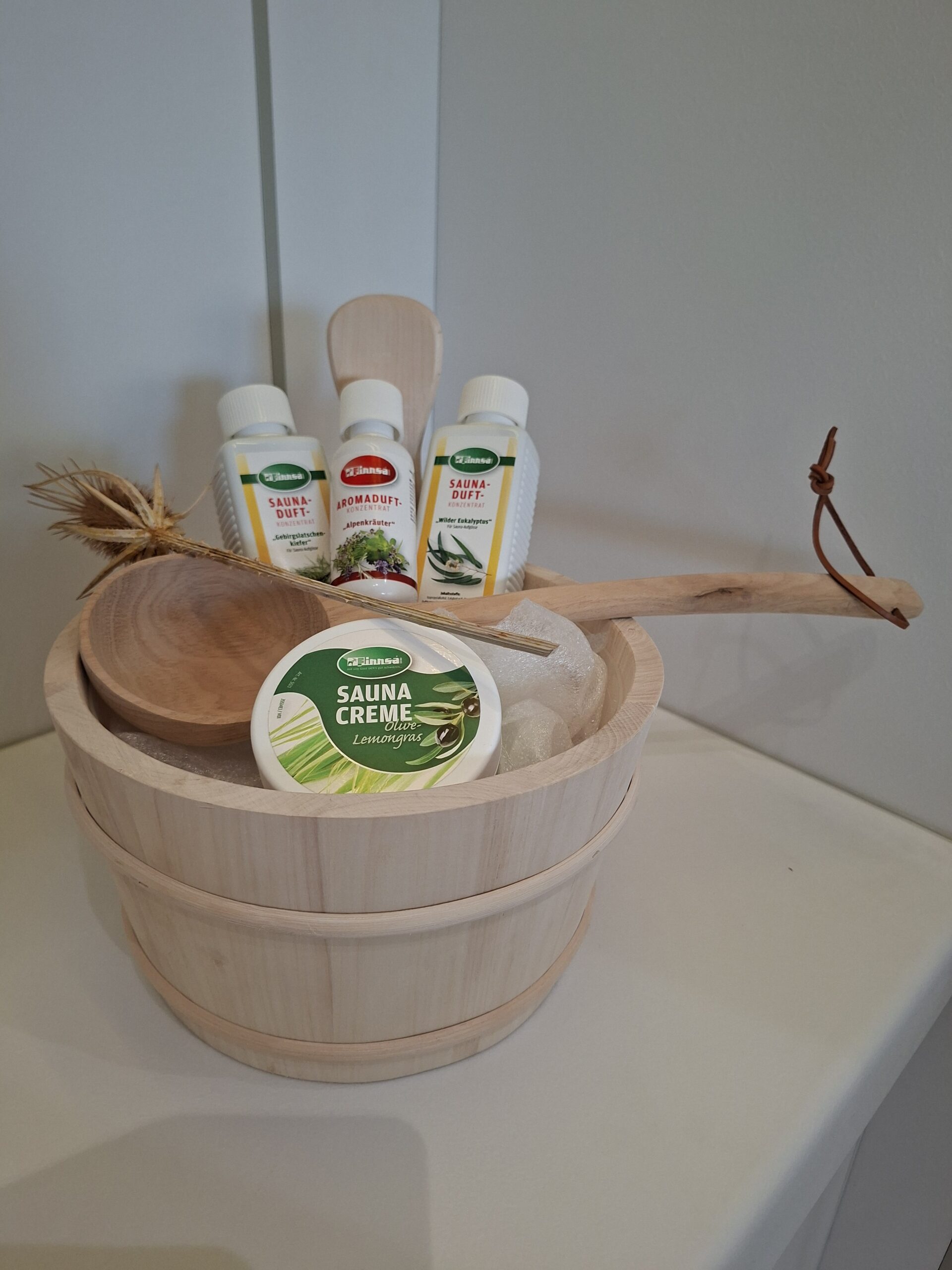 De houten sauna-emmer met bijpassende lepel vormt de basis voor ultieme opgietmomenten, aangevuld met krachtige natuurlijke geuren die lichaam en geest tot rust brengen. Geniet van de frisse eucalyptus, het kruidige Alpenkruid en de warme geur van bergdennen — alsof je midden in de bergen zit.