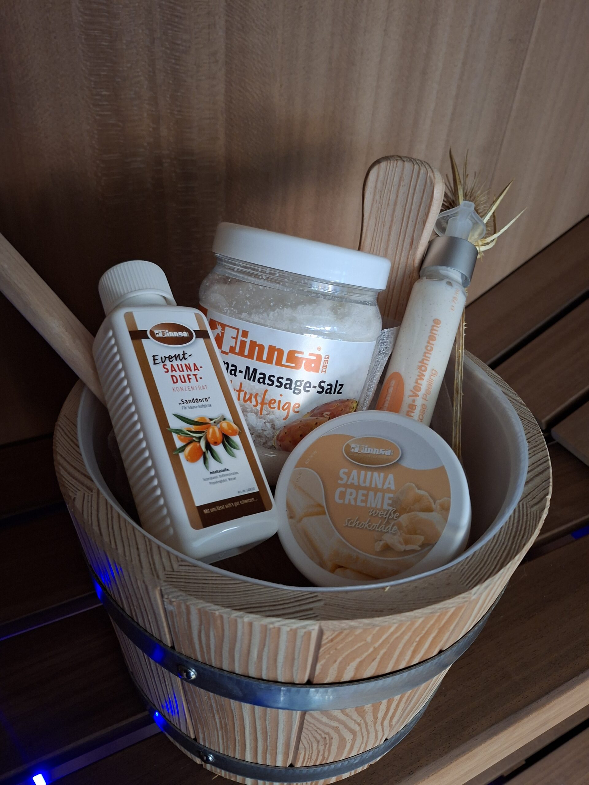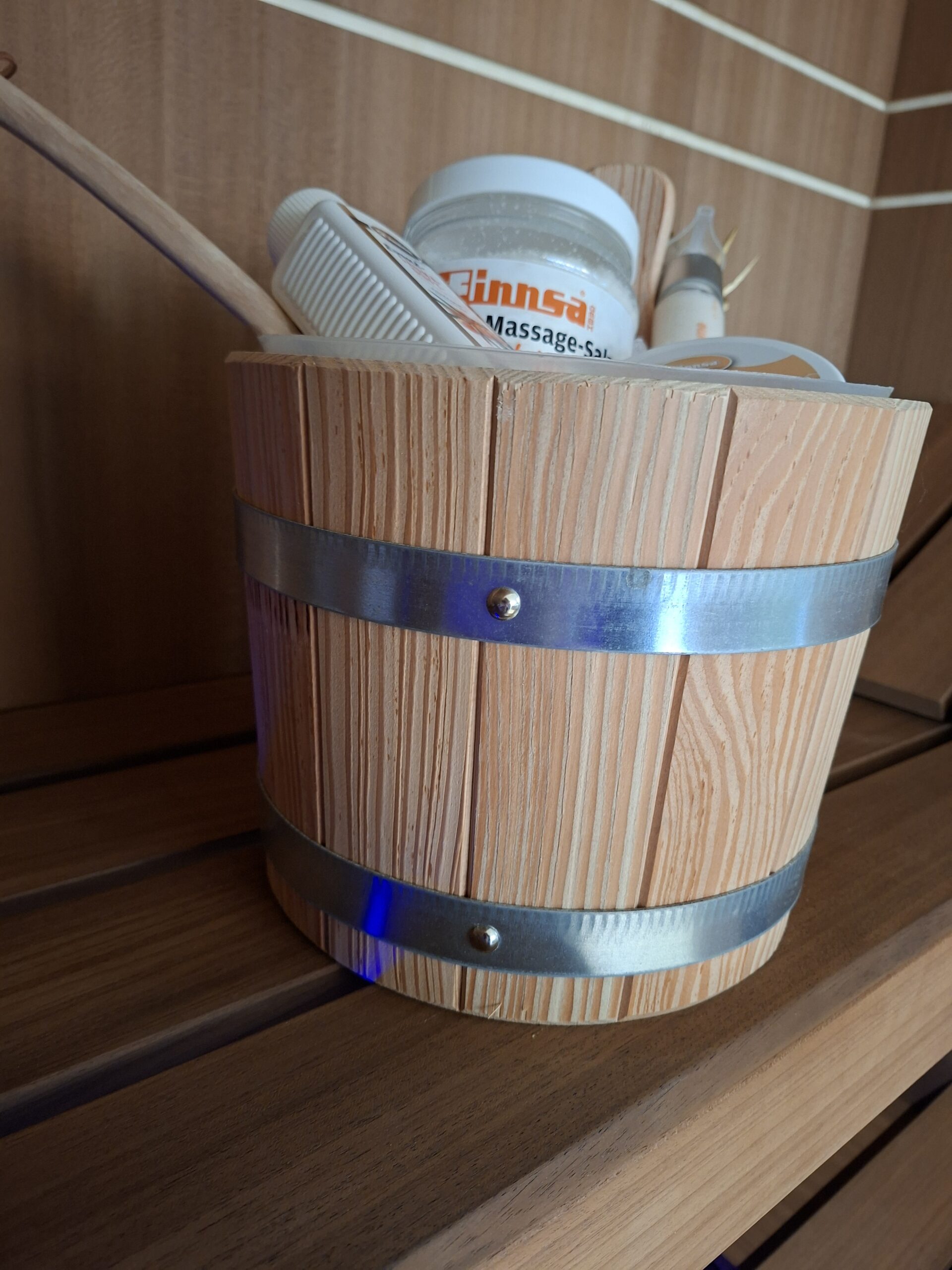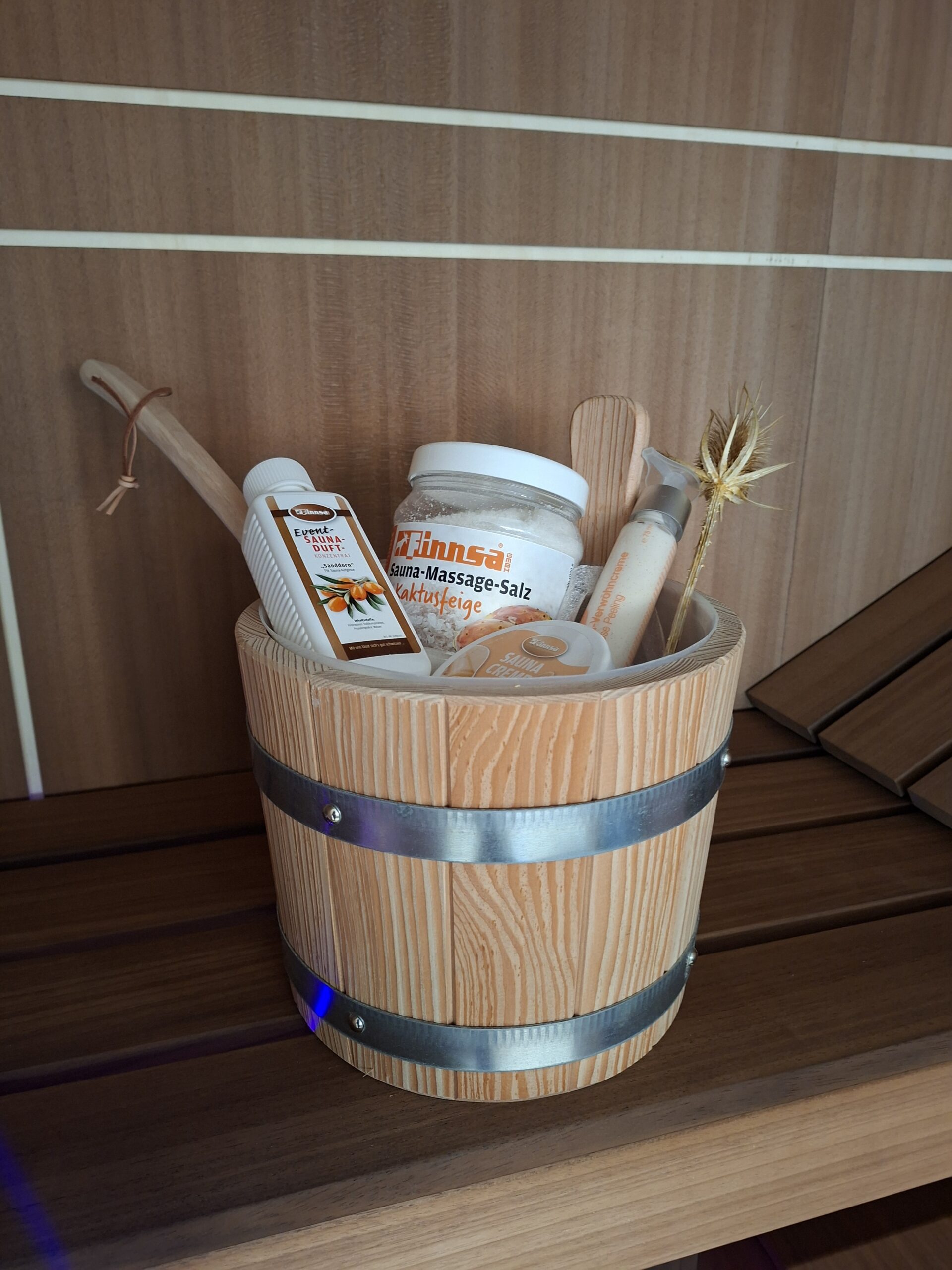 De stevige, duurzame emmer met houten lepel geeft meteen een authentieke saunasfeer en is gevuld met heerlijke verzorgingsproducten voor ultieme ontspanning.